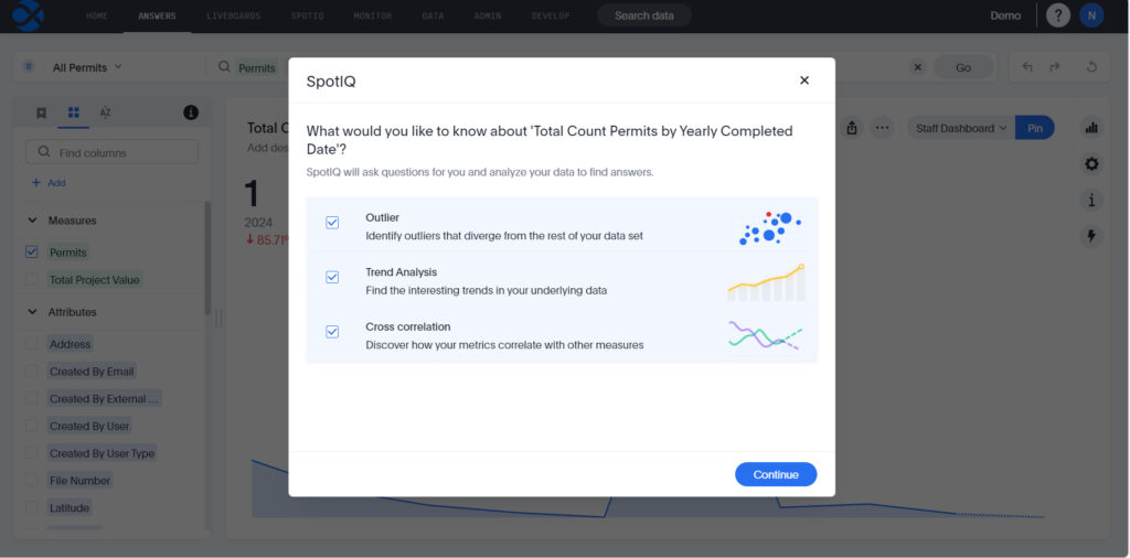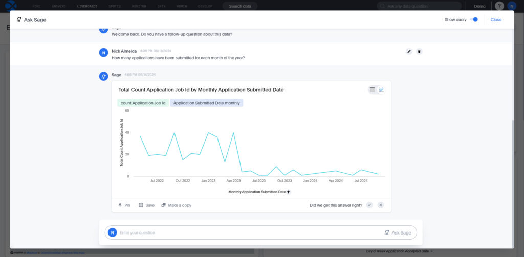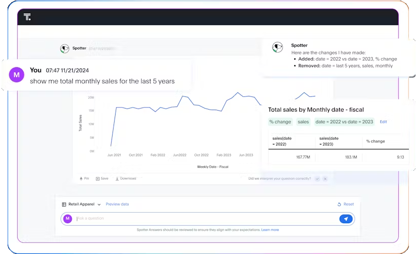 The breadth of questions it can support is unmatched – from comparisons and cohort analyses to time and location reasoning – and ThoughtSpot delivers the answers to these questions automatically.